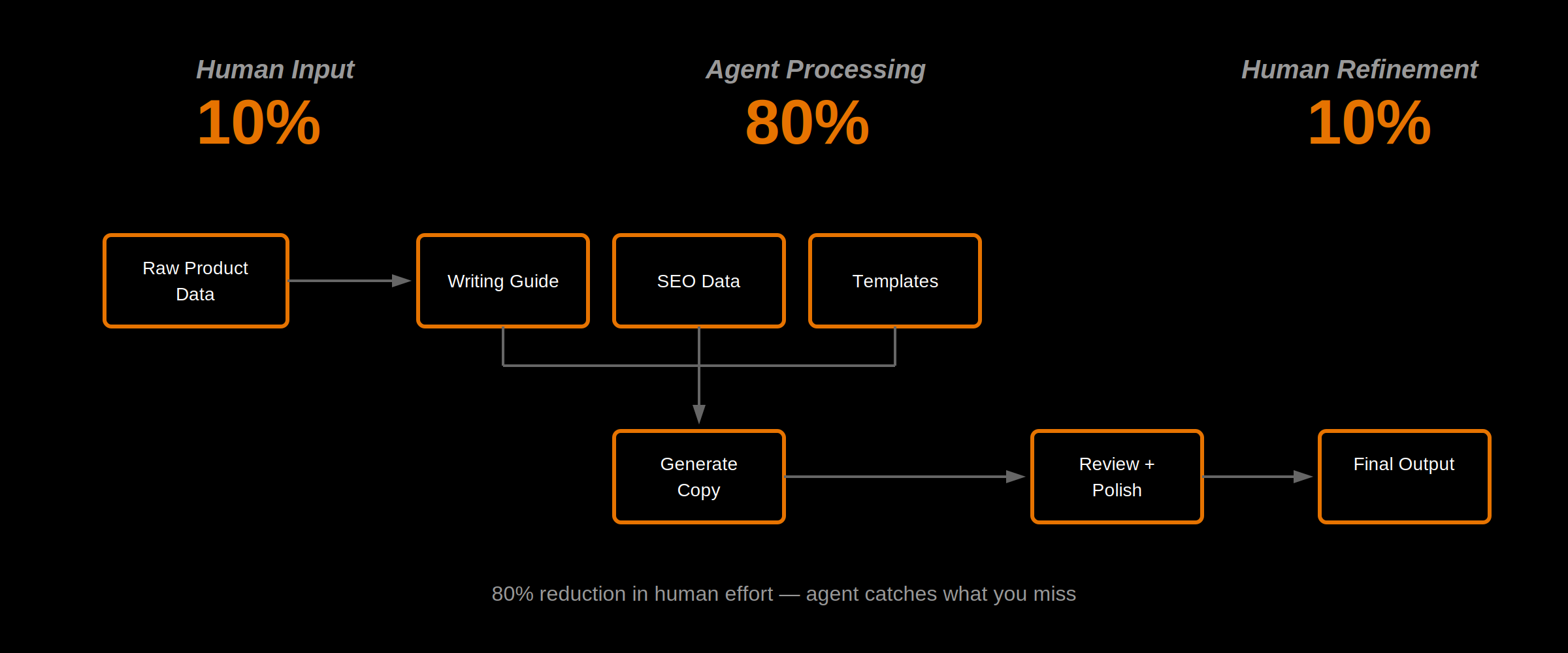 Manual cleanup remained. It always does. I think of it as 10-80-10: I spend 10% of the time on input, the agent handles 80%, and I refine the last 10%. That's still an 80% reduction in human effort—and the agent often catches things I'd miss.