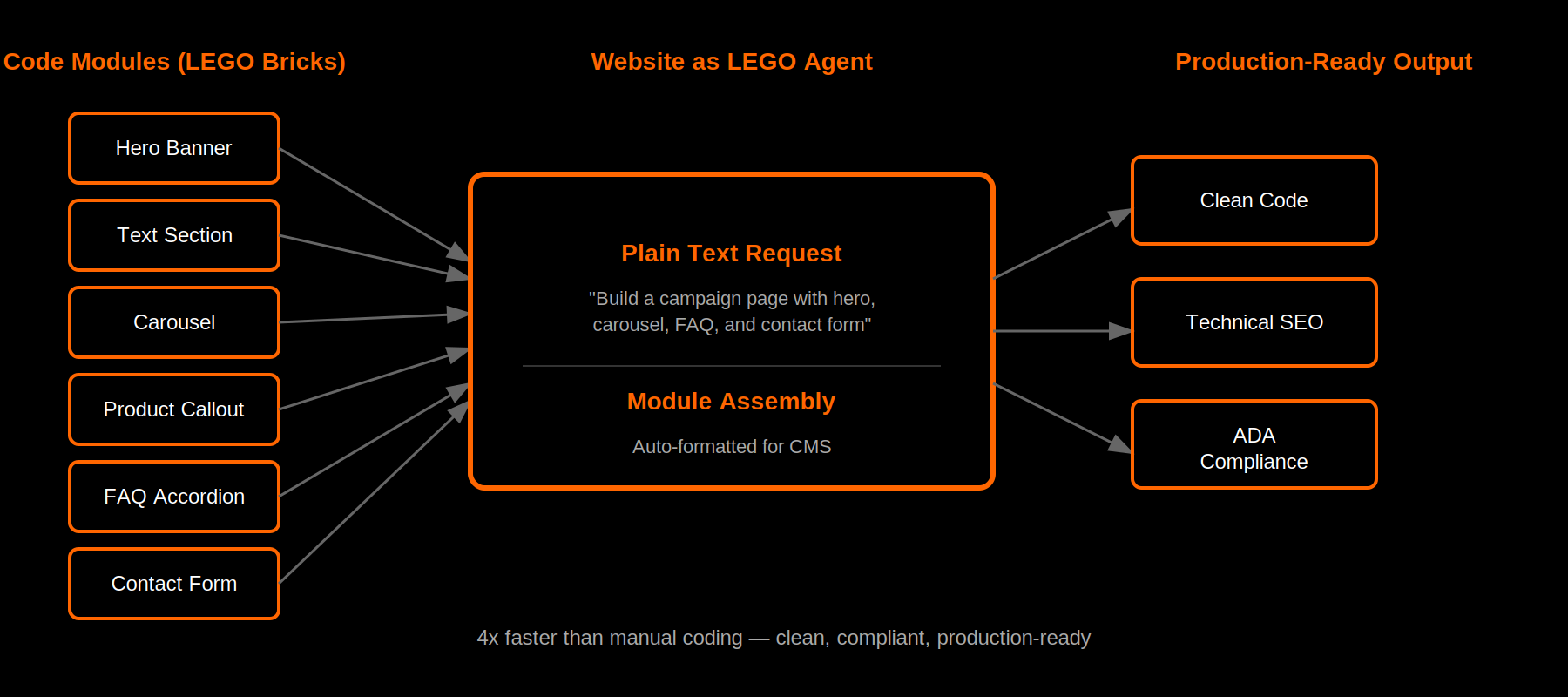 At Kensington, we solved part of this by building reusable code modules—full-width banners, accordions, carousels, product callouts. Modular building blocks that could be stacked into pages. But assembling and customizing those modules for each campaign still ate up hours.